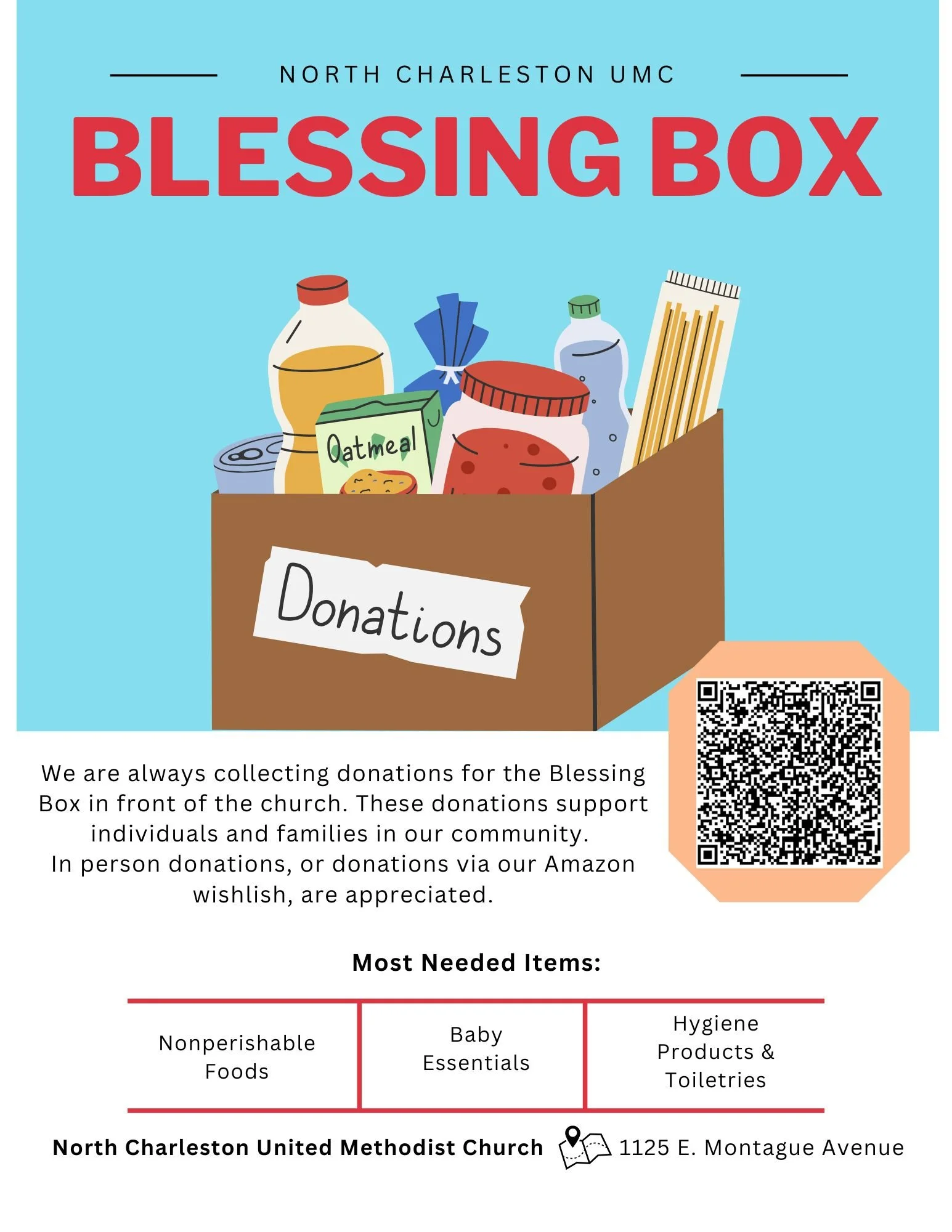 Donate non-perishable food items and toiletries to the blessing box located in front of the church for those in need in our community.