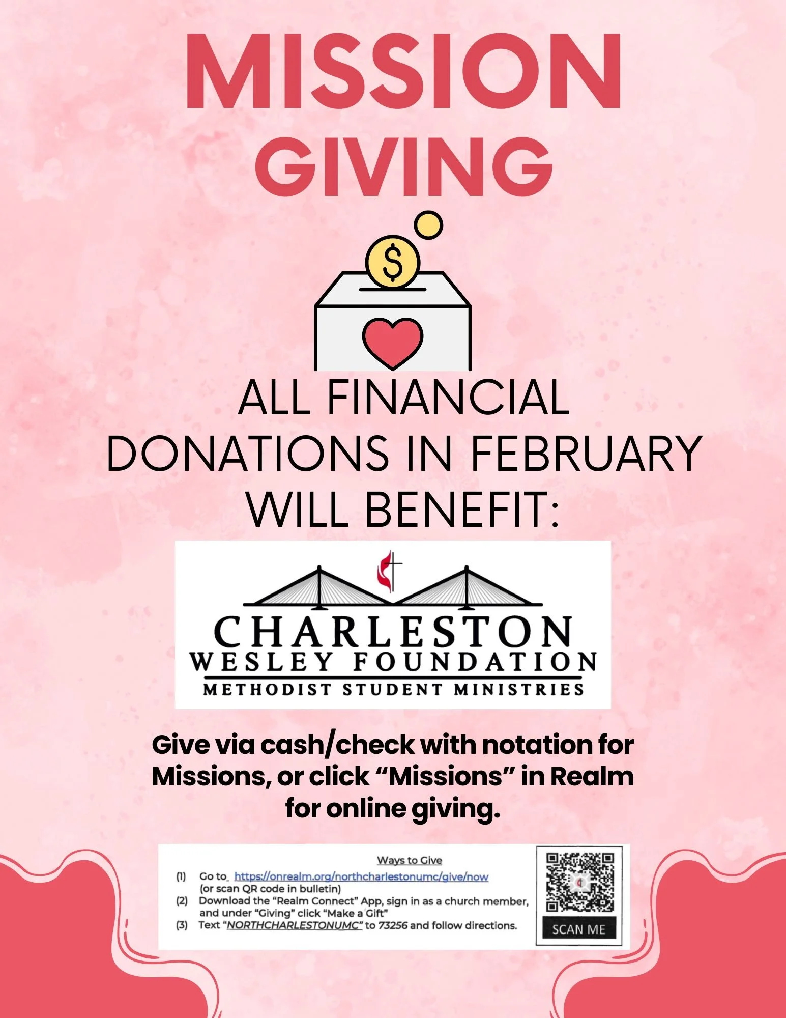 During the month of February, all financial donations to Missions will go to benefit the Charleston Wesley Foundation, our Methodist college ministry. Please see the graphic for more information about giving.