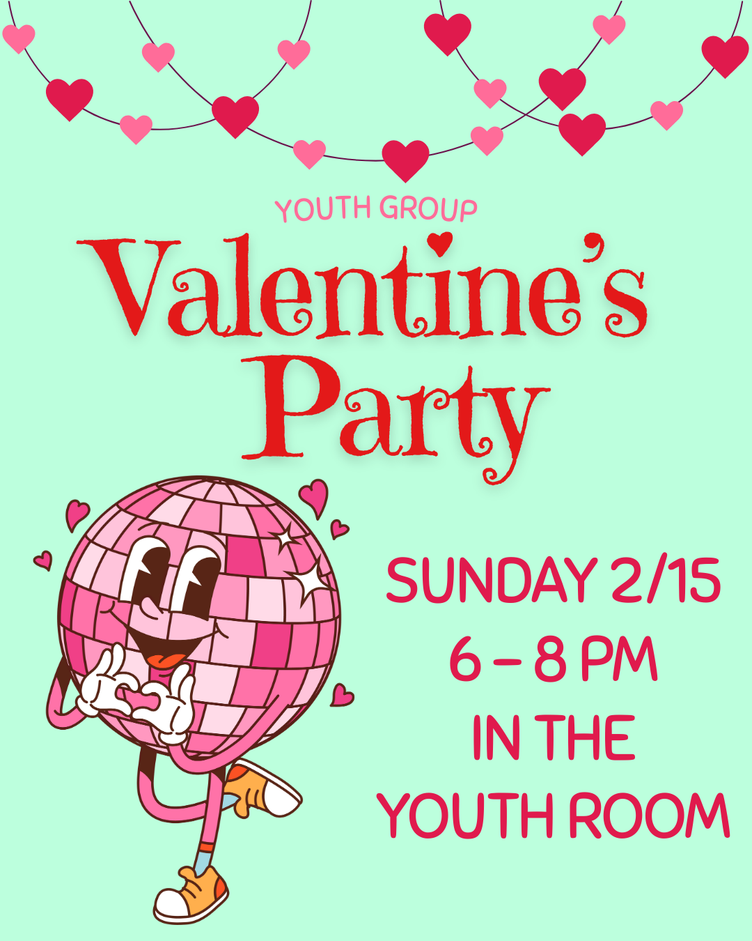 The 6th-12th Graders are having a Valentine’s Party! Join us in the Youth Room for dinner and games.