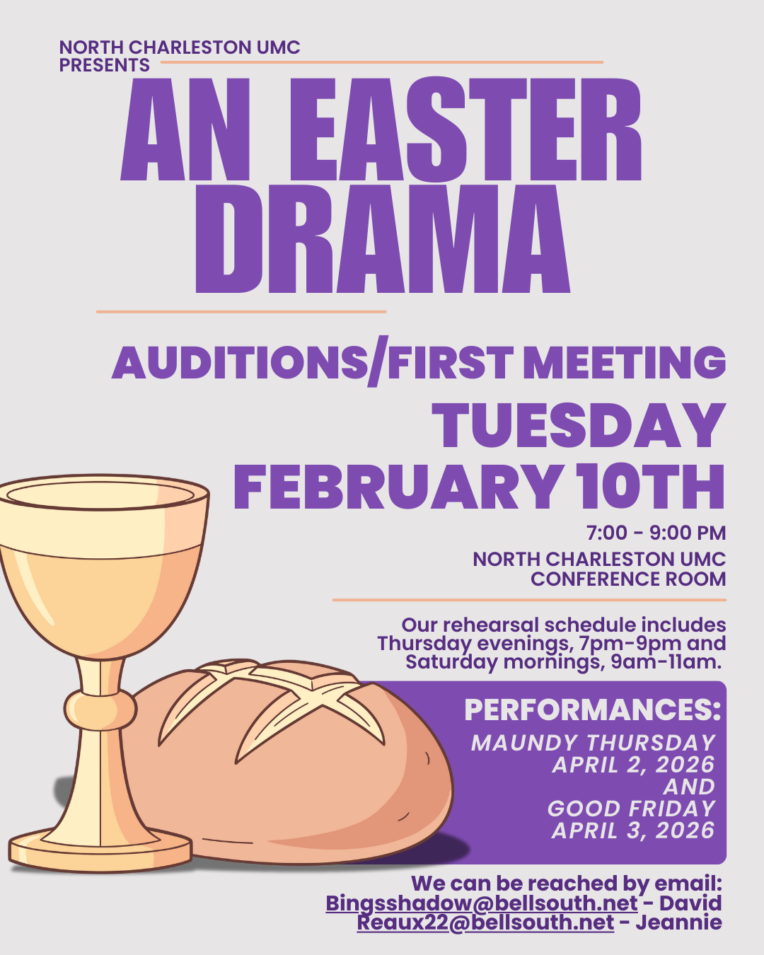 Easter is fast approaching and the excitement is beginning as we start the process that will become our Easter drama. We need your help to make this a resounding reality. We will meet Tuesday, February 10, 2026 at 7pm in the Conference Room at NCUMC for our first production meeting. We need actors, singers, set designers, prop masters, lighting, sound, etc. Don't hesitate to let us know how YOU can help.
