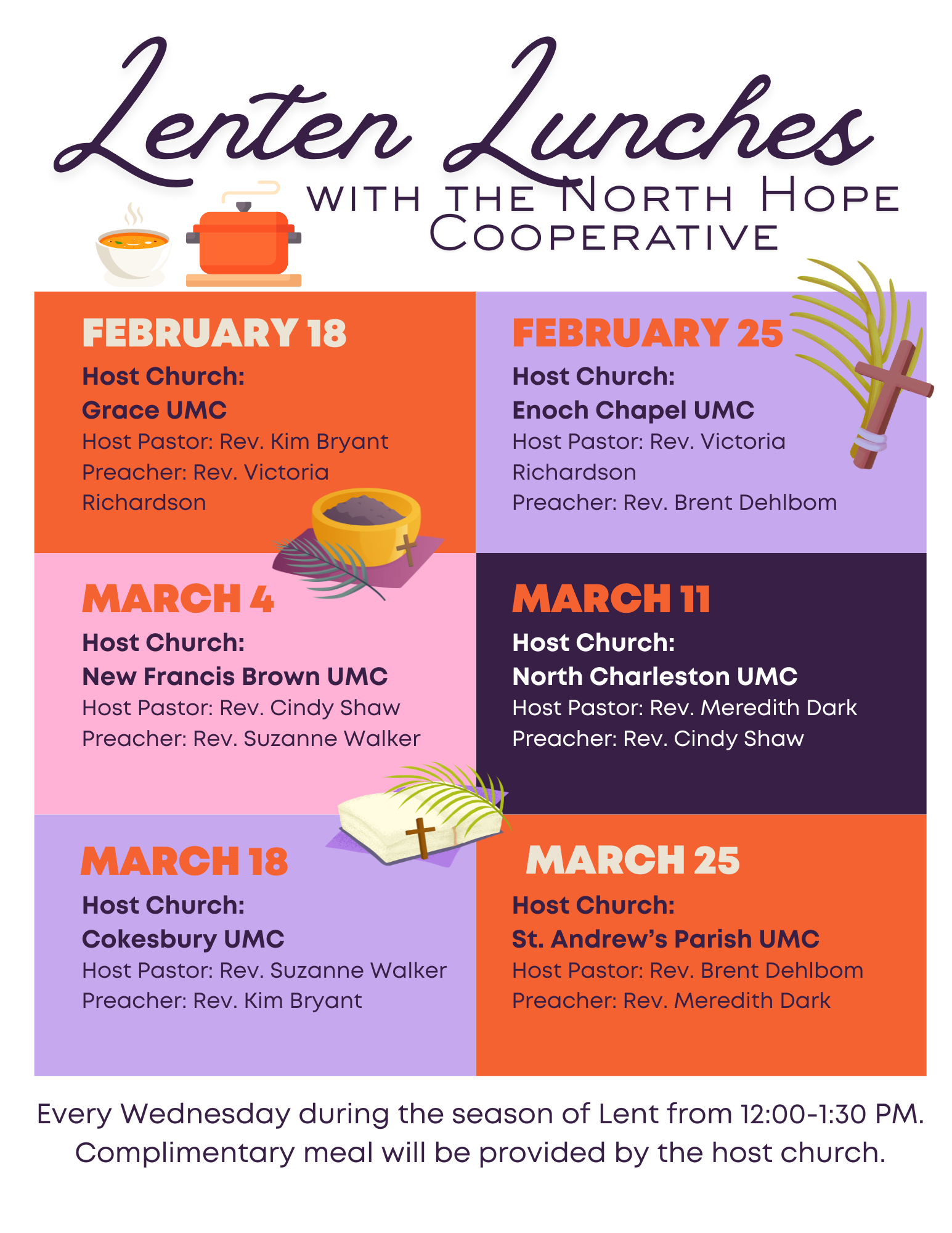 We have the privilege of hosting this week's Lenten Lunch for the North Hope Cooperative! Join us in Davis Hall for incredible fellowship with our sister churches, delicious soups given generously by our members, and what is sure to be an inspiring message from Rev. Cindy Shaw of New Francis Brown UMC.