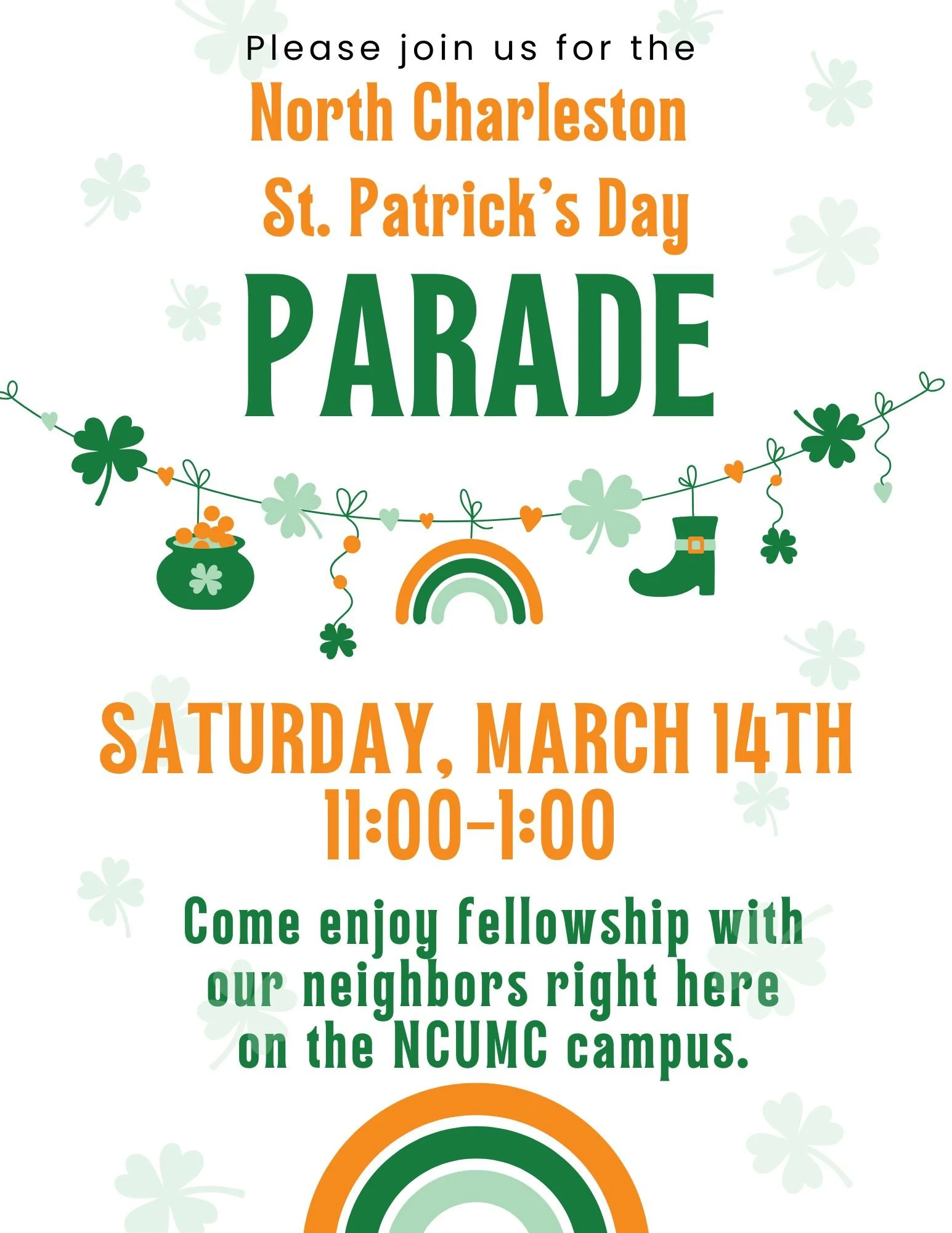 Join the Mission Committee on the NCUMC campus as we show the love of Jesus to our Park Circle neighbors during the North Charleston St. Patrick’s Day Parade!